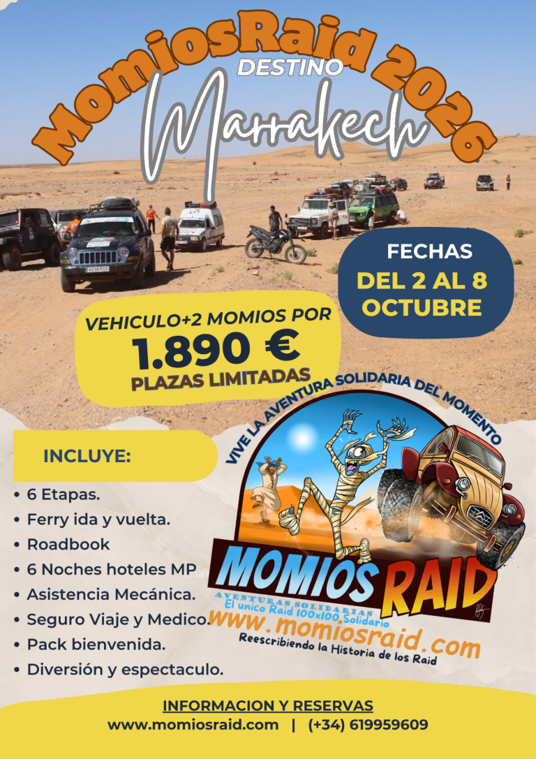 MomiosRaid es un raid de aventura de carácter solidario y sin ánimo de lucro que se celebra en el desierto de Marruecos. Está diseñado para participantes que buscan emoción, navegación off-road y superación personal, combinando el turismo con actividades solidarias y experiencias culturales únicas en un entorno desértico , donde visitaras parajes y sitios espectaculares, con la mejor compañía, amigos, muchas comodidades, con hoteles de primera y con muchas sorpresas que sin duda te dejaran una huella inolvidable.